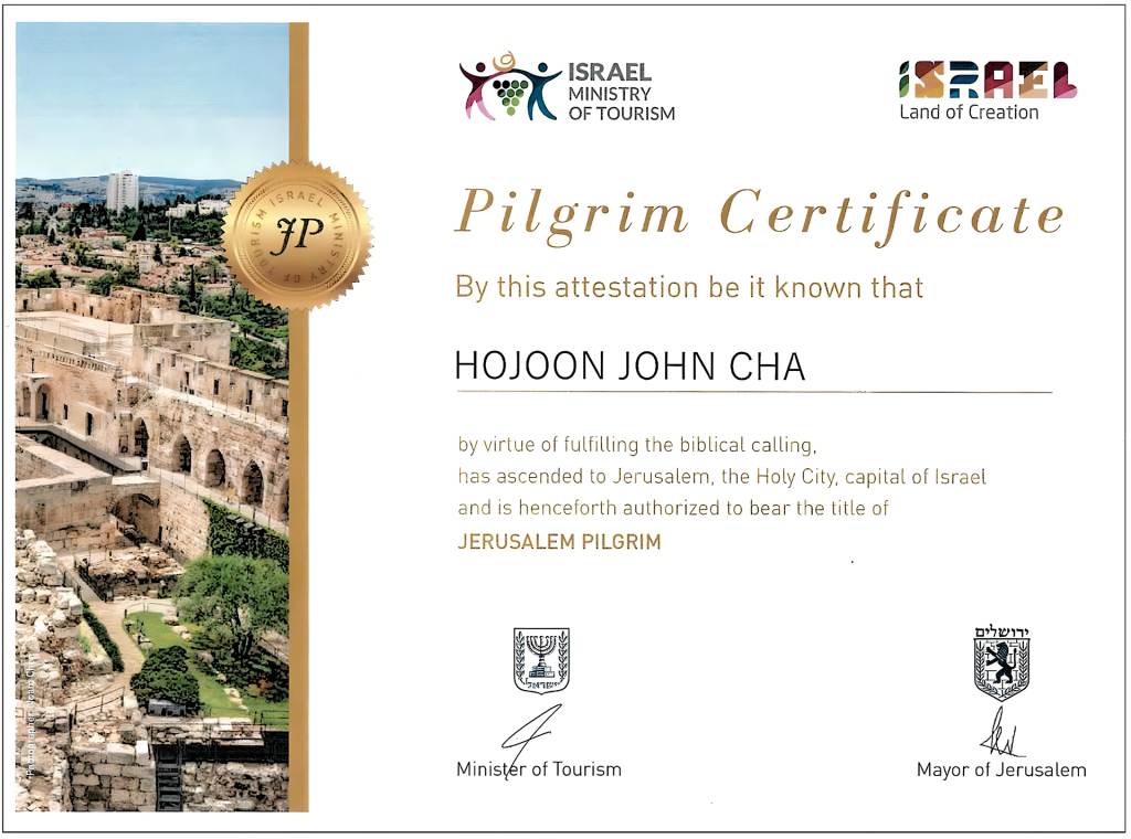 2023년에 솔로몬 제1성전 유적 탐사를 위하여 이스라엘을 방문하고, 동 정부로부터 ‘순례자 인증서’(Pilgrim Certificate)를 수여받았습니다.